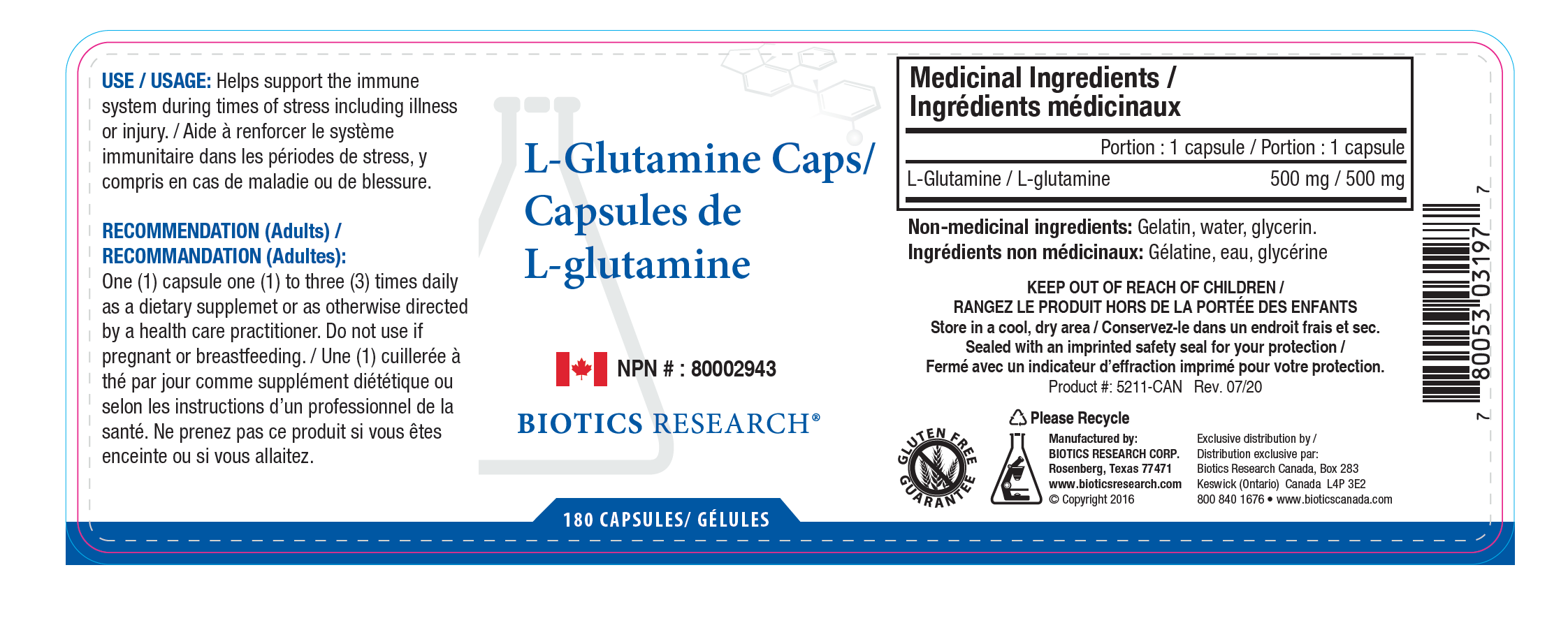 Ingredients: L-Glutamine (free form amino acid) nonhydrolyzed, naturally produced L-Amino Acid 500 mg
