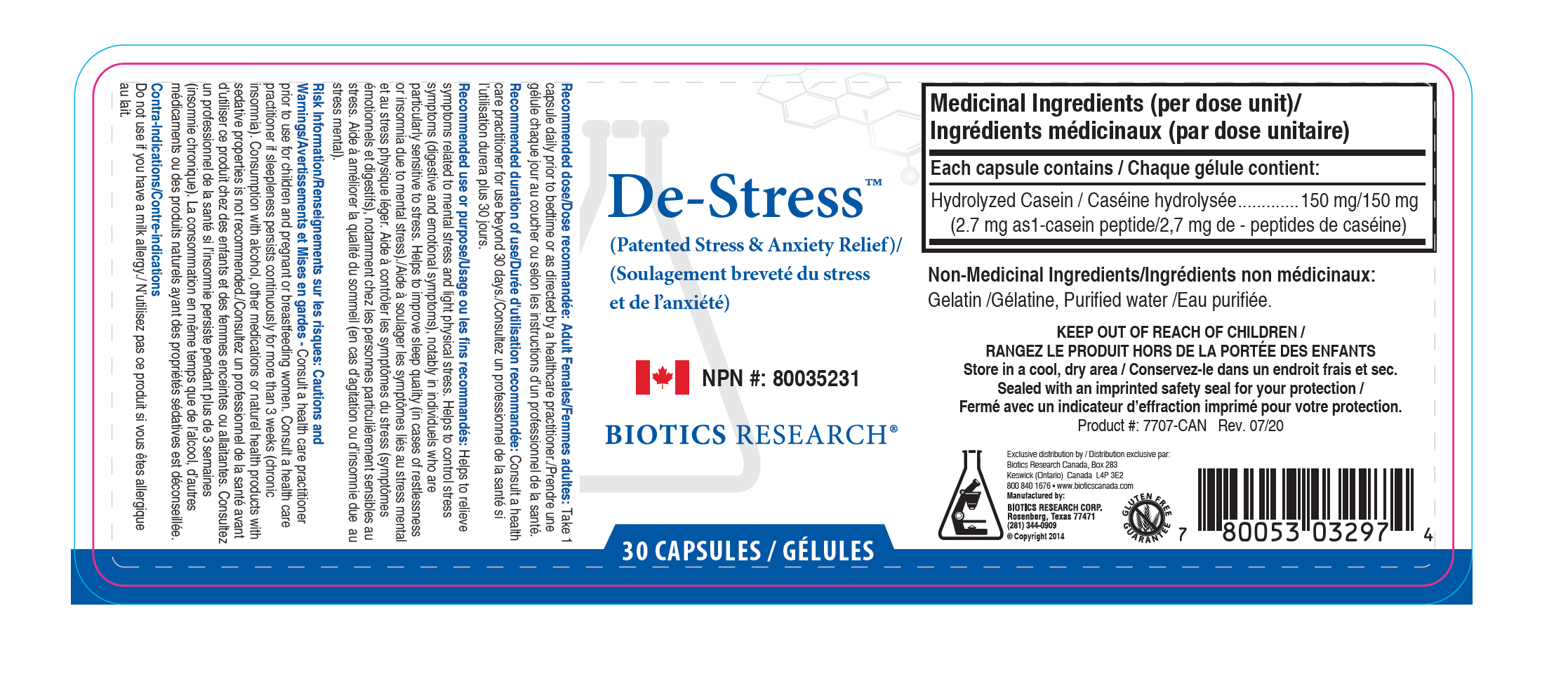 Indications: De-Stress is a patented, specially produced milk protein hydrolysate, which constitutes a specific peptide concentrate, having demonstrated anxiolytic activity. Anxiolytic activity refers to the action of medications prescribed for anxiety symptoms. Consider stress, anxiety, insomnia, adrenal hyperfunction, and stress-related disorders such as panic attack and phobias. The De-Stress casein hydrolysate was also shown to have a "protective effect" on sleep, when subjects were exposed to chronic mild stress.
